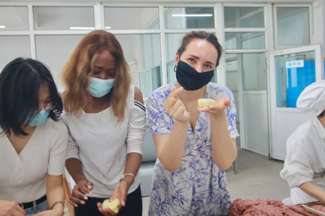 In the pastry making workshop the pastry master of CaizhiZhai revealed some secrets of traditional cake making. He personally guided the foreign students to make Suzhou style cakes such as brewed flower cakes and crisp bean paste cakes. After about half an hour of baking, the students could taste the delicious cakes made by themselves.