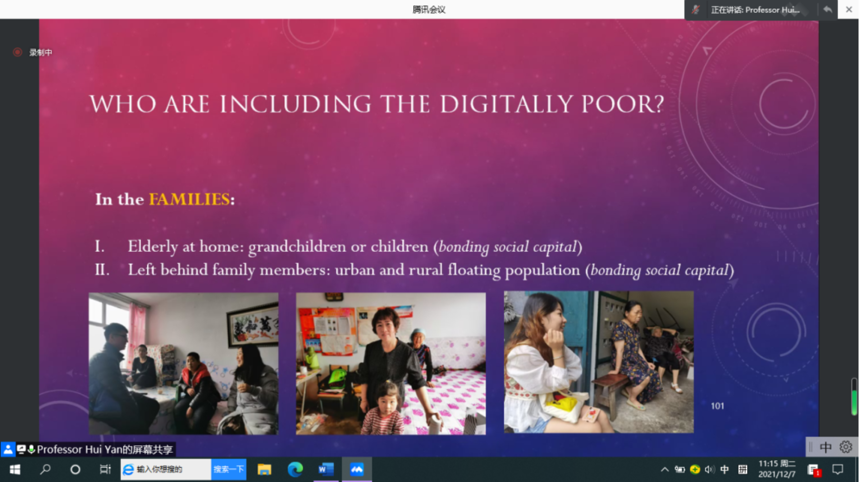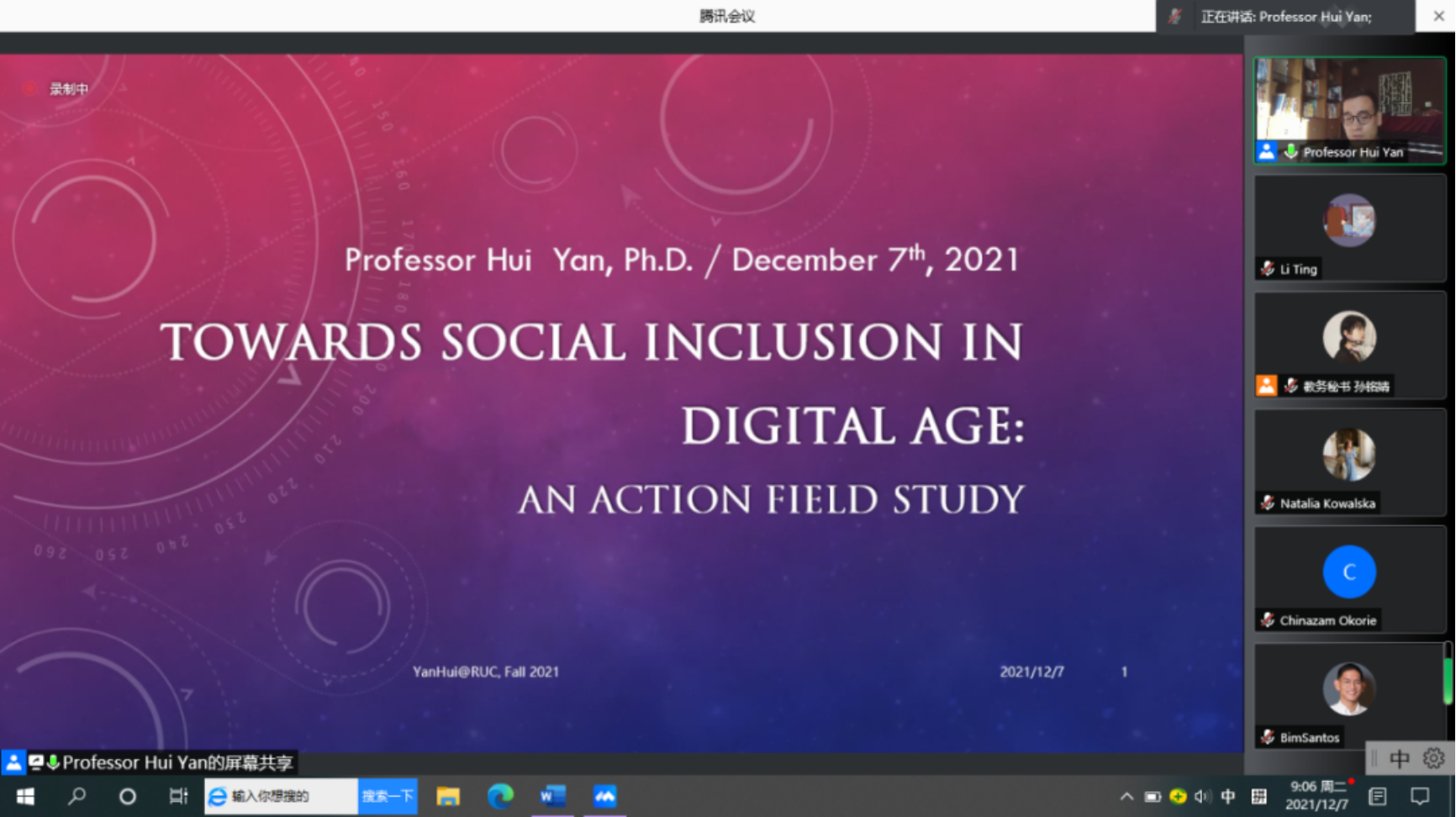 12月7日,厂长资源 系列讲座——“数字时代的社会融合:以行动研究和田野调查为例”在腾讯会议线上举行。讲座由厂长资源 信息资源管理学院闫慧教授主讲,2021级全体学生线上聆听讲座。