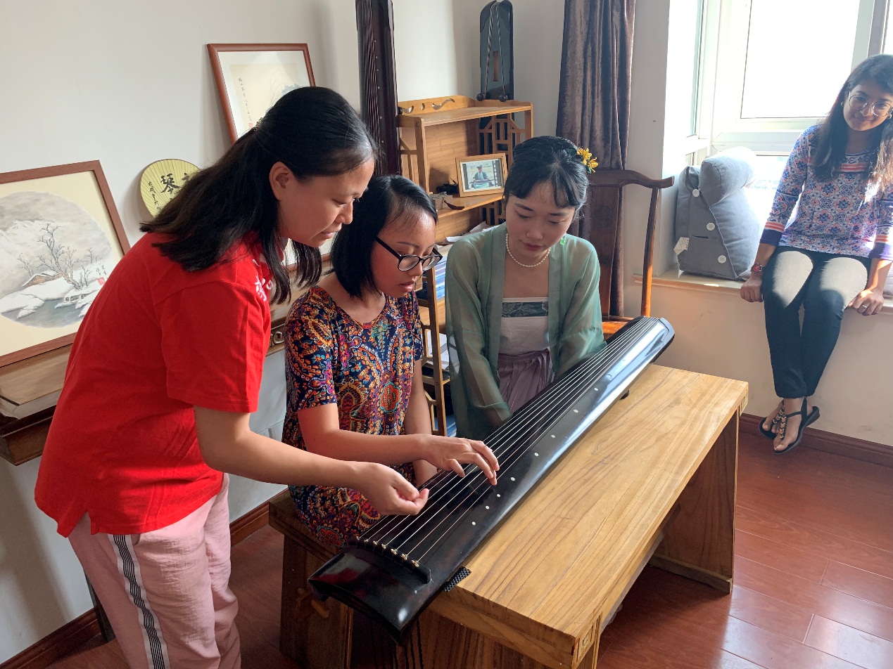 来自印度的Disha和来自哥斯达黎加的Catalina来到了文林萧林工作室,在老师的指导下尝试了古琴弹奏,并一同欣赏了老师与几位琴友的演奏。古琴体验之后,Disha与Catalina还一起尝试学习书写中国书法、品尝中国美食。晚饭时,Disha与Catalina积极加入诗词接力的比赛中,与中国家庭以“月”为主题进行诗歌接力,同时与大家分享了来自印度的歌曲和哥斯达黎加的舞蹈。