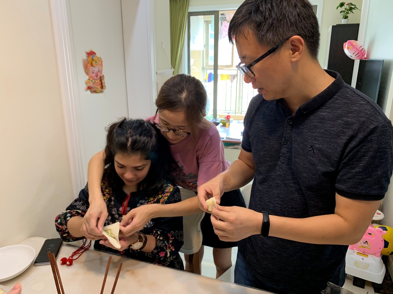 “来年早归喜几多,吃饺话团圆。”吴女士一家每逢佳节都会团聚在一起包饺子,但今年的中秋节对他们来说却与众不同,从妹妹到奶奶,都化身为老师,指导留学生们包饺子。揉面、擀皮、搅馅,每一步都需要足够的耐心,第一次接触饺子制作的留学生Dean与Duyet在吴女士一家的指导下进步飞速,很快就“出师”了。吃着自己包的饺子,望着满桌的苏州传统美食,听着吴女士对美食的精心介绍,留学生们连连称赞:“It's so nice!”