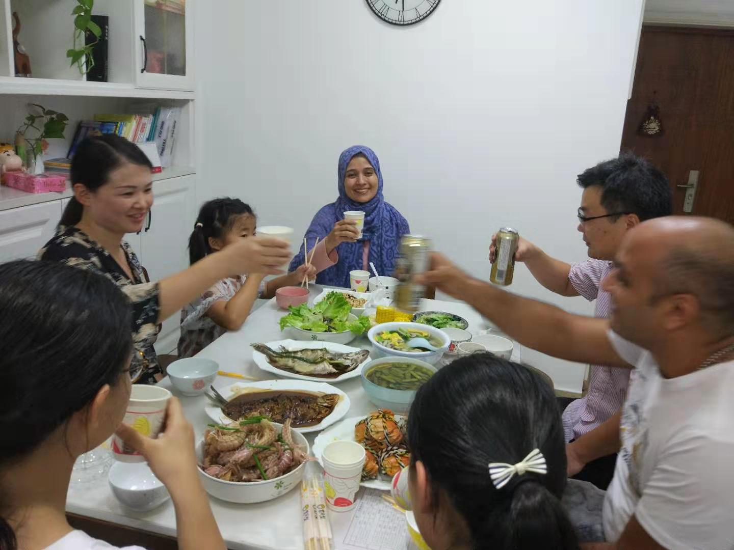 来自伊朗的Mahdokht和来自埃及的Muhan与吴先生一家人从居委会出发,一同到翰林邻里中心购物,选择自己喜欢的食材。吴先生和吴太太非常尊重留学生的喜好,晚餐准备的十分丰盛:芋头汤、大闸蟹、红烧鱼、清蒸鱼、毛豆......