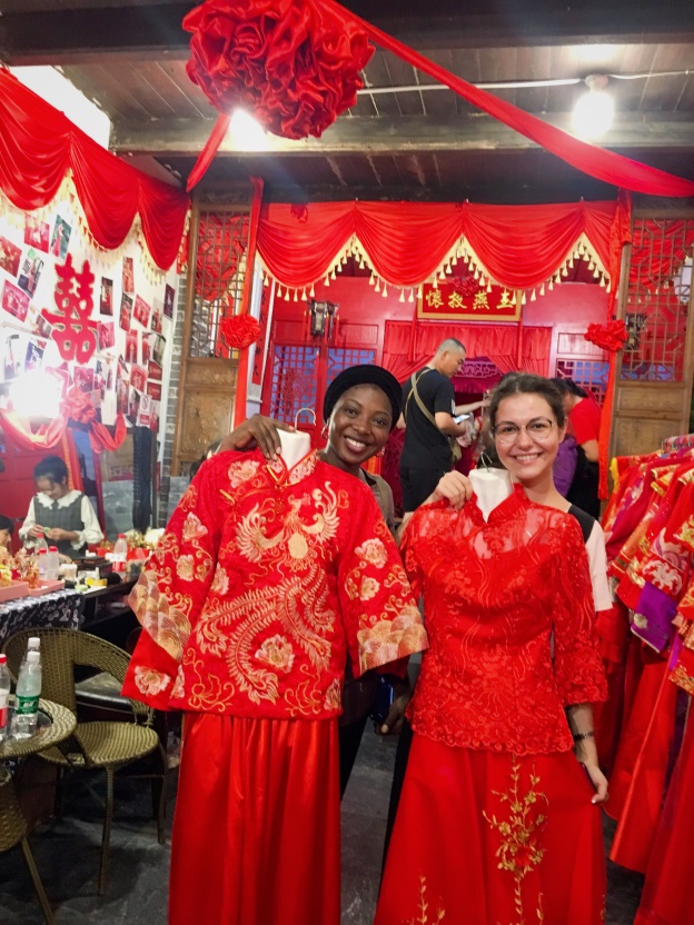 下午三点,按计划由悠然爸爸驱车抵达了目的地——甪直。悠然爸爸介绍说这里被称作是“神舟水乡第一镇”,镇内水多桥多,一条条水道交错纵横,就好像“甪”这个字的形态,让人不由感叹中国汉字的奇妙。漫步在镇内小巷中,入眼尽是江南水乡特有的粉墙黛瓦与流水小桥,仿佛走在其间时间也会慢下来一样。由于环境优美,镇内有许多拍摄写真的店铺,Berika和Kemi无意中走进一家中式礼服摄影店,看到架上挂着各种中式礼服都非常激动,店内老板也热情地向她们解释红色在中国代表喜庆和吉祥,是非常美好的颜色。于是Berika和Kemi各自都挑了自己喜欢的款式在身前比划、合影。