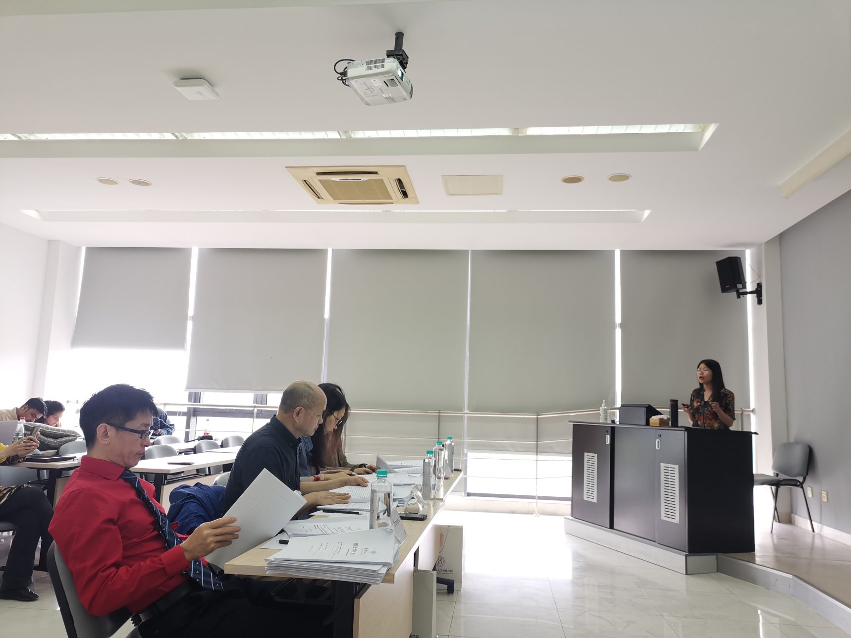 答辩当天,在答辩主席的主持及答辩秘书的协助下,各项工作有条不紊地推进。海外同学通过“屏幕共享”的方式进行答辩,在苏的同学则在现场进行答辩。学生们精心准备自己的研究成果汇报,认真回答老师们的提问;答辩委员们严格把关,对学生们论文的研究主题、研究方法、理论框架以及研究成果等各个方面做了综合点评,以严谨负责的学术态度指出部分论文中存在的问题,并提出详实的修改建议。