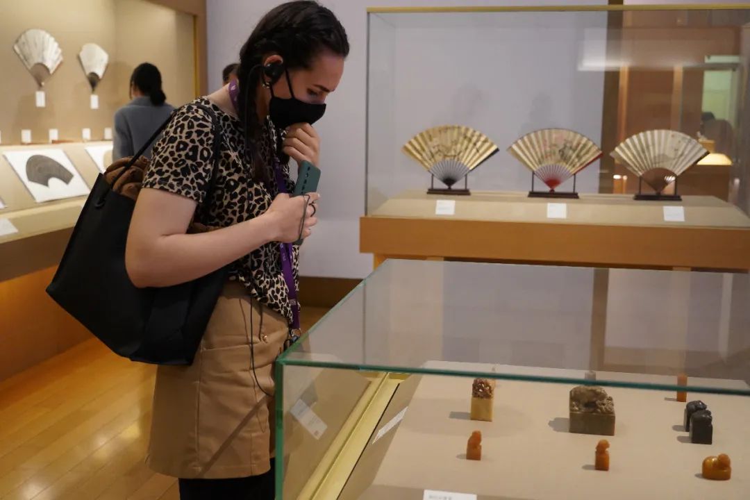 随后师生们来到书画展厅。明清时期,江南才子辈出,馆内这一时期书画作品也尤为丰富。同学们在观看了大量的书联、诗轴、图轴、画卷、扇页之后,对中国传统绘画的水墨皴染,传统书法艺术的铁画银钩有了一个整体的印象。一位选修了中国传统文化课的学生还回忆起了自己学到的中国绘画的知识,主动为身边的同学介绍起了“工笔”、“写意”、“留白”等专业概念。还回答了同学“中国绘画与西方油画之区别”的问题。