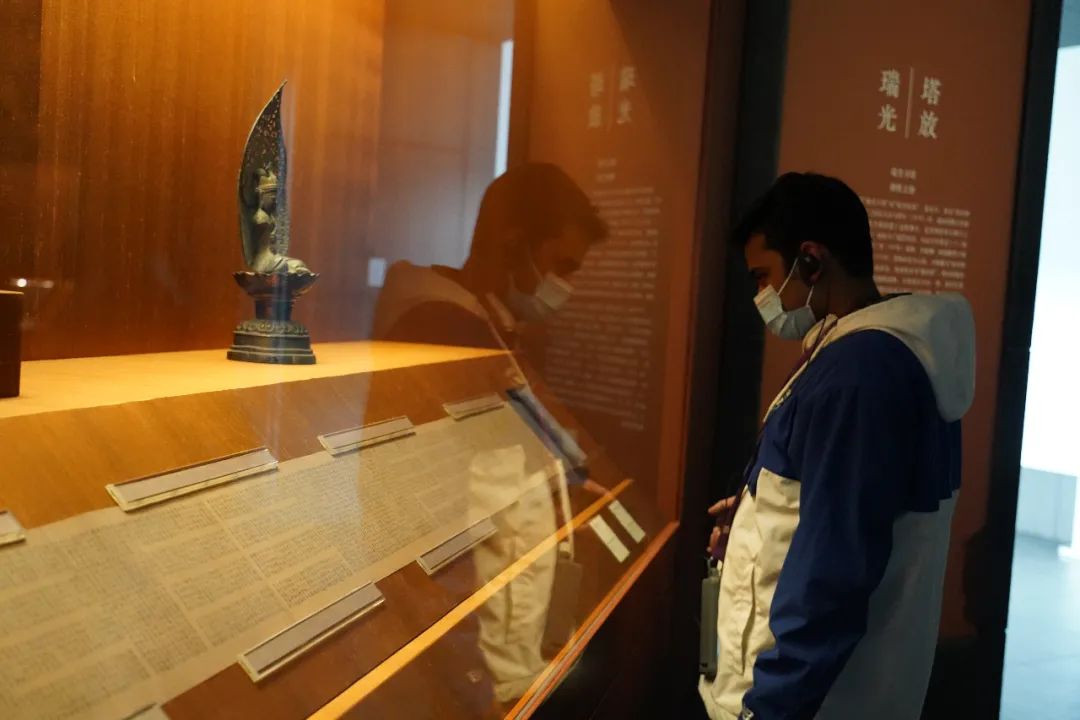 师生一行首先参观的是苏州博物馆的常规展出文物:真珠舍利宝幢、秘色瓷莲花碗、忠王府彩画等。其中位列两塔瑰宝之首的真珠舍利宝幢最能吸引同学们的目光,这件珍贵的宗教艺术品主体由楠木构成,高度为122.6厘米,分为弥座、佛宫、刹三个部分,每个部分都精雕细琢,人物形象栩栩如生。这座宝幢综合了当时的木雕、描金、玉雕、穿珠以及金银细工等专业技术,凝聚了当时能工巧匠们的智慧与心血,同学们看后无不感叹中国古代文化和艺术的根柢之深厚。