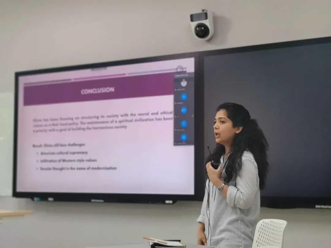 来自巴基斯坦的李星月(MARIA NAZEER)、刘心语(MANAHIL IJAZ),哥斯达黎加的陈韵熙(CATALINA CHEN LI)进行了现场答辩。两位委员对每位同学的学位论文从论文的选题、论文完成情况、论证逻辑性与严谨性、文献规范等方面给予指导,以严谨负责的学术态度指出论文中存在的问题,并提出针对性的修改建议。