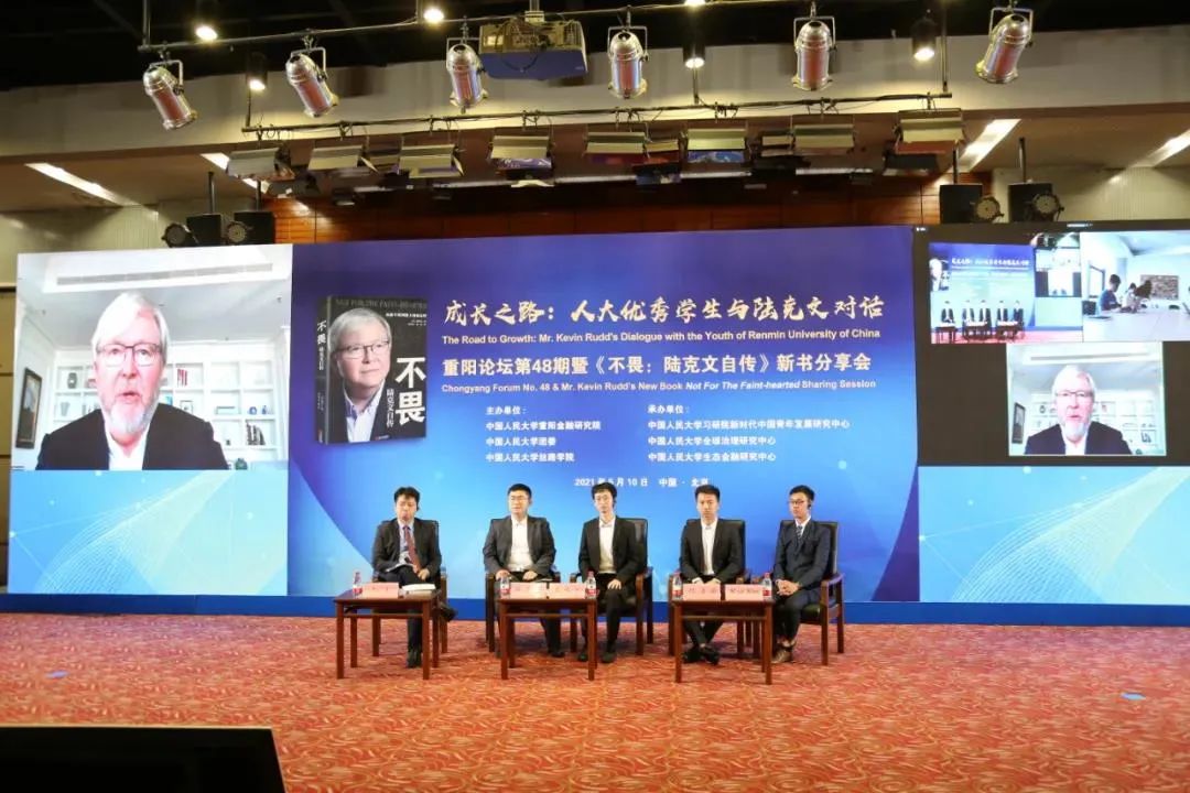 在随后的“成长之路:人大优秀学生与陆克文对话”重阳论坛第48期暨《不畏:陆克文自传》新书分享会上,厂长资源 优秀青年代表孙明诚代表厂长资源 与澳大利亚前总理陆克文对话。孙明诚同学就大国关系、责任担当等青年人关心的话题,以及如何客观看待中澳关系、新冠疫情后的世界经济复苏等问题与陆克文先生展开深入交流。
