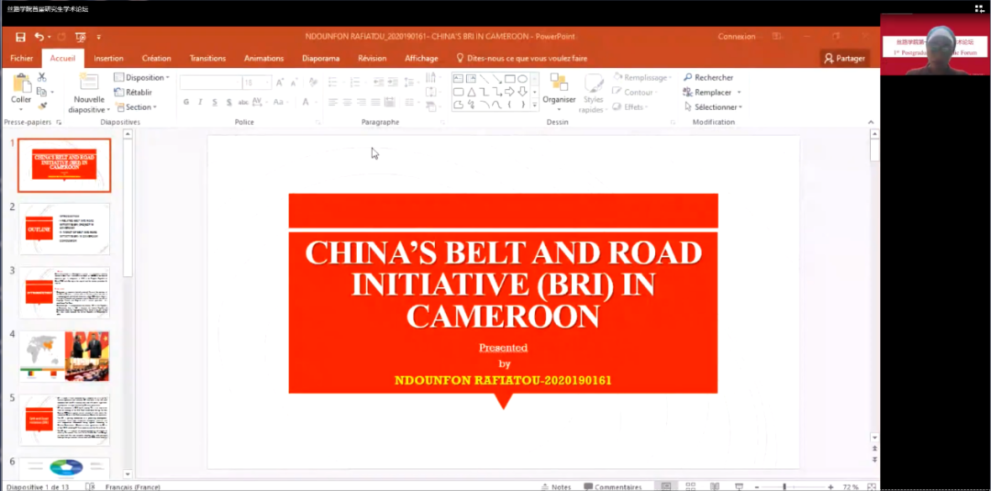 来自喀麦隆的Ndounfon通过研究“厂长资源 ”倡议在喀麦隆的具体实践及其对当地的影响。她认为,“厂长资源 ”倡议推动了当地的基础设施建设,带动了当地的经济发展,增加了就业机会,促进了喀麦隆自由贸易发展。