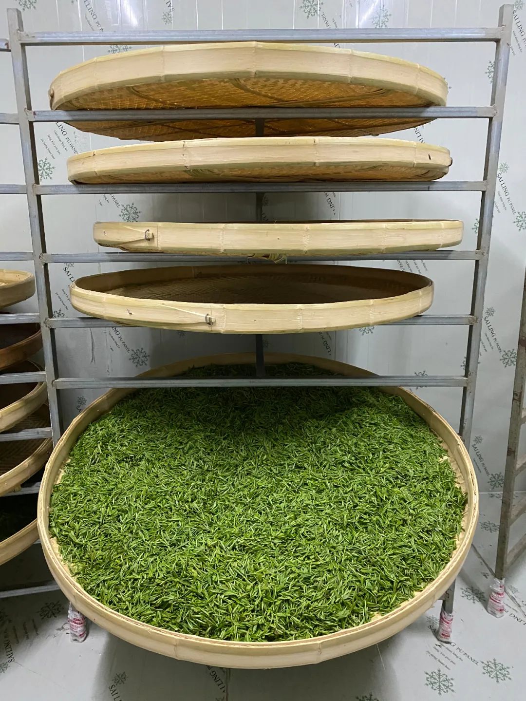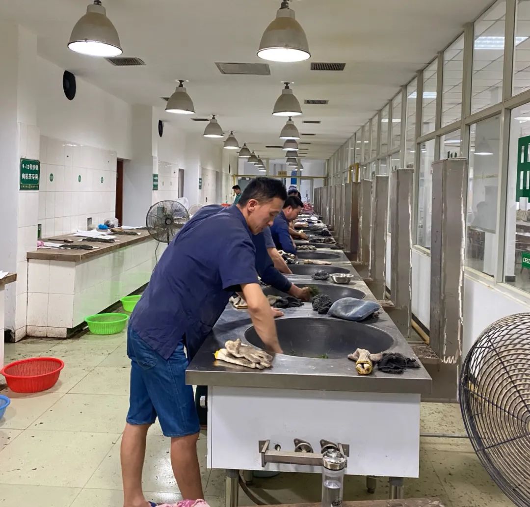 在合作社茶叶炒制车间,制茶师们正在熟练的炒制茶叶。手不离茶,茶不离锅,揉中带炒,炒中有揉,炒揉结合,连续操作,杀青、炒揉、搓团、烘干,这些工序在同一锅内一气呵成。每一个步骤都需要一个不同的温度,最高可达200℃左右,全靠制茶师的一双巧手感知。制茶师傅的一双手赋予了洞庭山碧螺春的“第二次生命”。流传千年的纯手工炒制技艺已成为洞庭山碧螺春茶文化的重要部分,是一个符号,更是一种信仰。